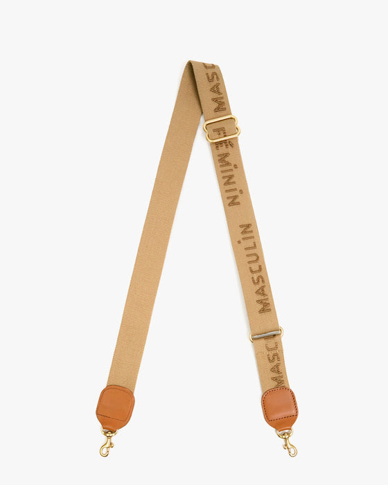 • Masculin Féminin nylon webbing, leather trim, and brass snap hooks