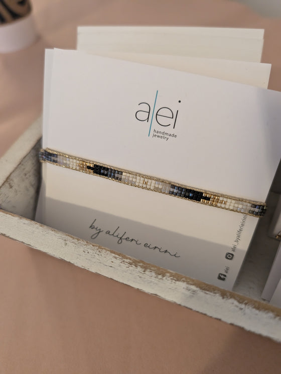 Handmade beaded jewelry crafted in Greece by artisan Eirini Aliferi. No two pieces quite alike--all created with care on a loom. Pull-tight rope closure.