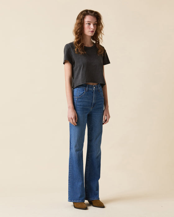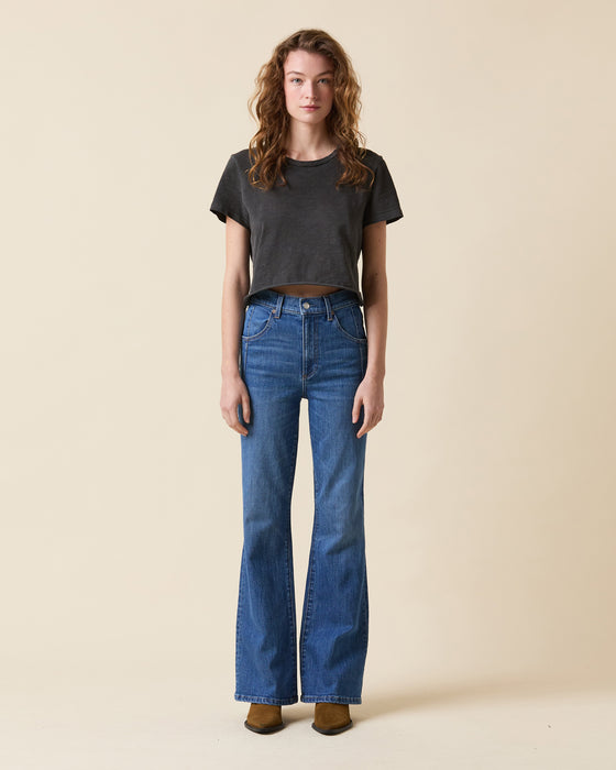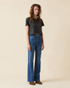 "The Farrah Flare is crafted from supersoft, lightweight denim, offering all-day comfort with a luxe feel. Designed to sit high on the waist, they feature a full-length, flared silhouette that elongates the leg.