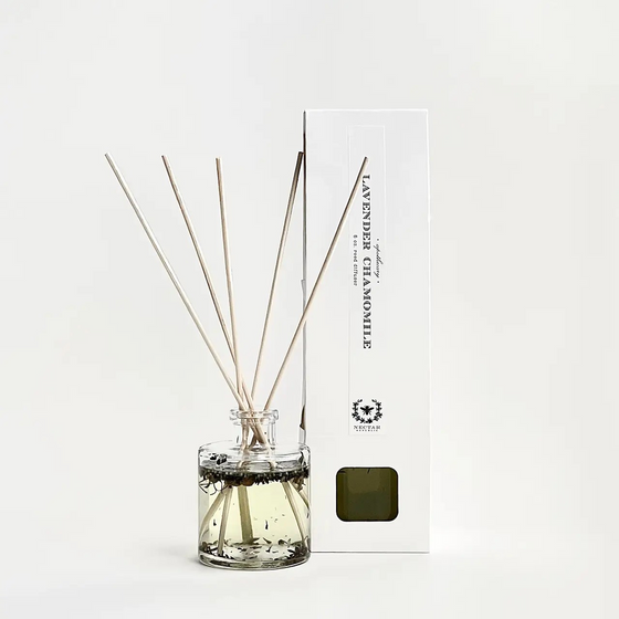 "5 oz. bottle of non-toxic reed diffuser solution blended with phthalate-free fragrance oil, essential oils, lavender and chamomile herbs and sealed with a synthetic cork. Packaged in a white box with 6 natural rattan reeds. Our diffuser solutions is - non-toxic - Di Propylene Glycol (DPG) free - Volatile organic compounds (VOCs) compliant in all 50 states - Made with 50.1% renewable resources - 100% biodegradable DIRECTIONS: Gently remove cork top over sink. Be mindful of not spilling the solution. Add reeds to the diffuser bottle and soak for 30 mins - 2 hours. Once soaked, gather reeds, lift, flip and soak the other end of the reeds in the bottle. It may take up to 24 hours for the fragrance to fully diffuse. For optimal fragrance, flip the reeds periodically, such as every few days or once a week, to keep the scent fresh and strong."