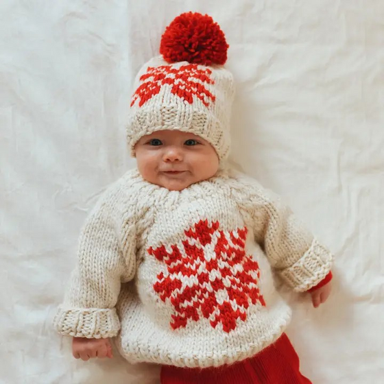 "This hand-knit sweater features a snowflake design in red yarn on the front, adding a charming touch to your child's winter wardrobe. The Natural hued color and chunky yarn provide a cozy feel, while the raglan sleeves with cable knit detailing add a touch of sophistication. With its soft neckline, this sweater ensures easy dressing for your little one, making it a practical choice for busy mornings. Our sweaters are partially knit from recycled, sustainable Polyester yarn made from plastic bottles. We are on a mission to help reduce the world's plastic pollution problem ♻ • Hand Knit in China • 60% Acrylic, 40% Recycled Polyester" -H