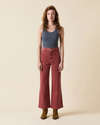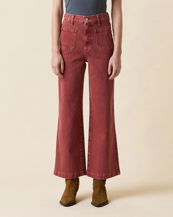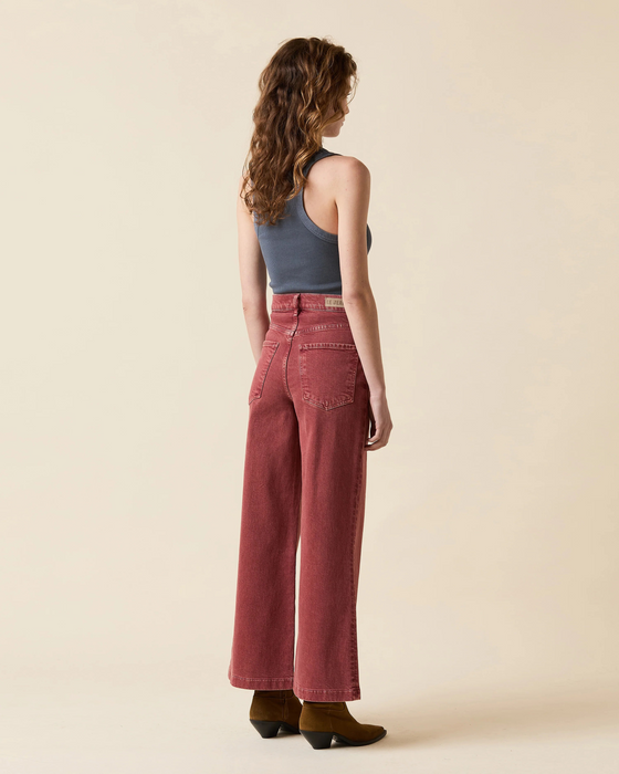"The Virginia WideLeg is crafted with a flattering high-rise waist and a tailored fit through the hips. Its slim wide-leg silhouette, paired with a rich spice-colored denim wash, makes it endlessly versatile for the season. Made in Los Angeles